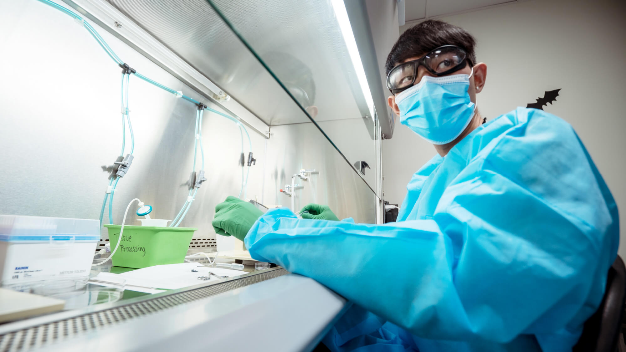 “Y’all ready?” Clark asks. In the tissue processing lab, which the team has affectionately dubbed the bat cave, Clark and Ho have unpacked the cooler from the van, which contains a bottle of clear liquid packed on ice. Floating in the liquid, a special buffer Ho made fresh that morning, is a small blob of tissue, pink and beige.