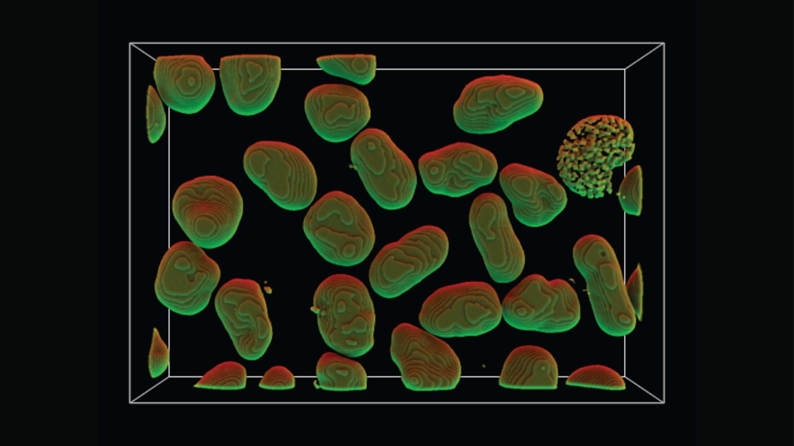 Researchers at the Allen Institute for Cell Science want to know what a normal cell looks like. It might sound like a simple research question, but after analyzing images of hundreds of thousands of human stem cells with different tags to light up different parts of the cell, the scientists are coming to understand just what a huge range of normal exists among even the same kind of human cell growing in a dish. In the image above, a protein known as h4B is genetically engineered to light up under the microscope. h4B is part of a structure that organizes DNA inside the cell’s nucleus; this image thus represents the overall shape of human DNA and its associated proteins in each cell. The image was processed to find the clean edges of the structures and then further modified using an in-house graphics tool known as AGAVE, which creates realistic-looking light sources. Here, software engineer Dan Toloudis used the tool to “shine” green and red light on the DNA structures. —Rachel Tompa, Ph.D.